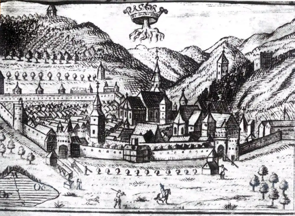 The fortress of Brașov in 1750. Note the crown with roots, based on the legend of King Solomon of Hungary and used in the present day city flag.